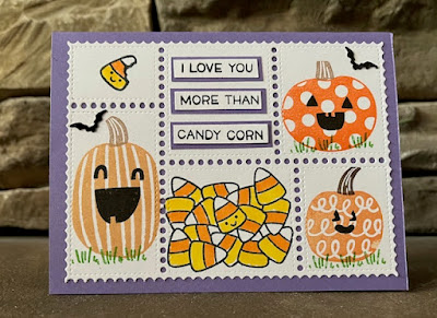With our 105 degree heat this week in NC, I got out my Halloween stamps and started my Halloween cards. This is one of my favorite stamps from Purple Onion which is about 5 years old (if I had to guess!) I watercolored it and stuck 3 bats on it using black shiny paper. (Bat die cuts are by Impression Obsession and are 3 years old)